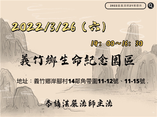 好消息!好消息! 111年3月26日(六)下午2點本鄉生命紀念園區邀請嘉義慈悲協會理事長上湛下嚴法師,蒞臨主法。於清明節前夕,特於本園區舉辦殊勝的慈悲施食、煙供、藥供、供燈法會。以法會種種勝妙功德回向本園區內所祀先人眾等,歡迎民眾撥空前來參與,慎終追遠,為先人超薦回向,祈願闔家平安、身體健康。